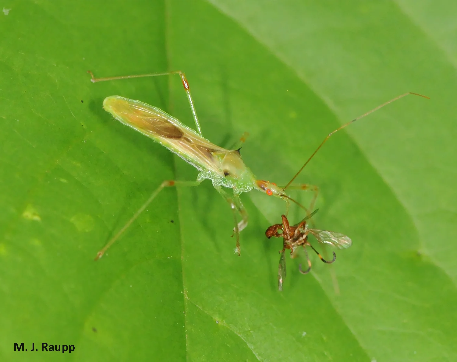 A small wasp falls victim to the sticky legs and hungry beak of Zelus.