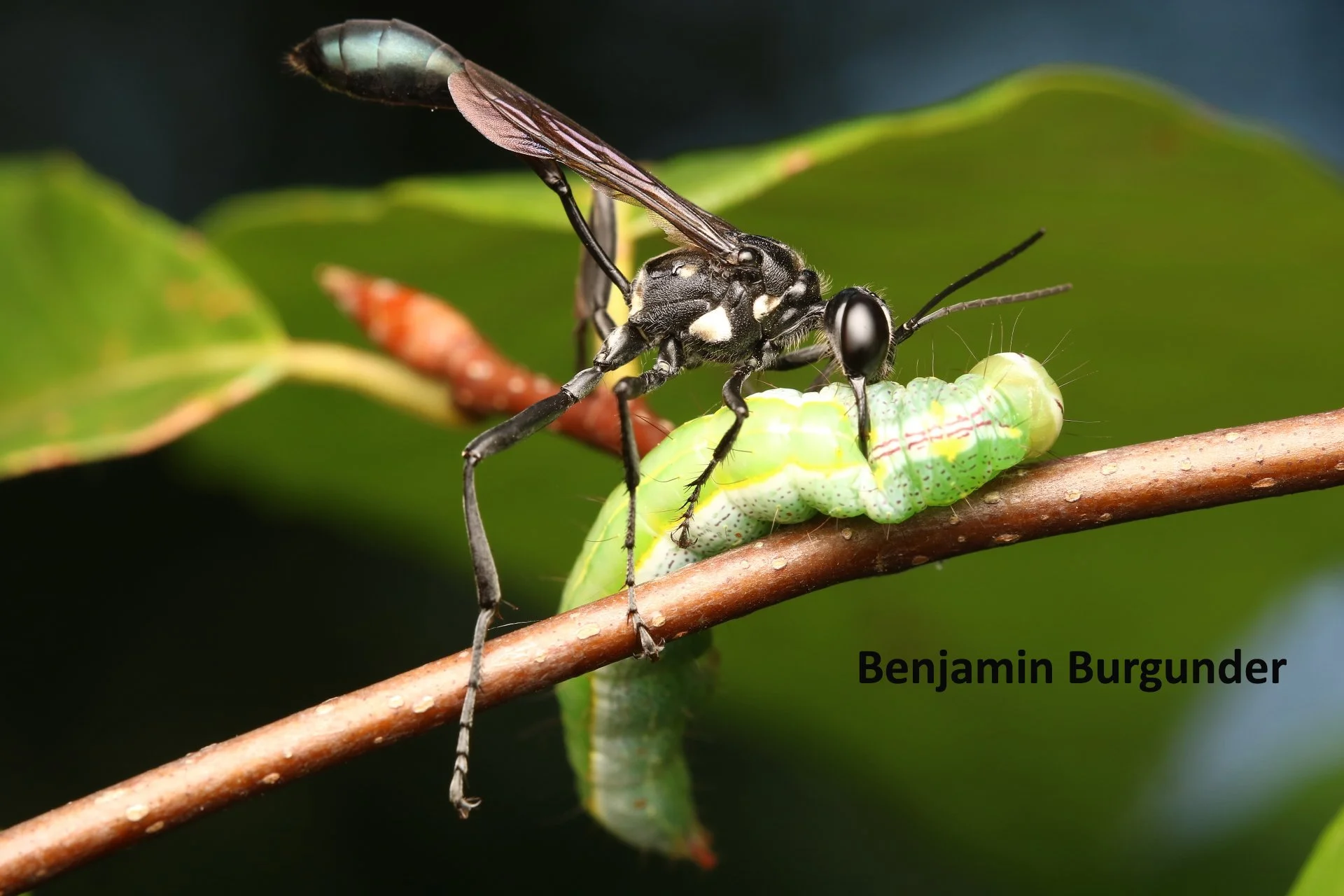 Interesting and entertaining accounts of thread-waisted wasps including “The habits of aculeate Hymenoptera” by William Ashmead, “Sleep in insects: An ecological study” by Phil and Nellie Ray, “Insects: Their natural history and diversity” by Stephen Marshall, and “Predatory Wasps (Hymenoptera) of the Yucatan Peninsula” by Maximiliano Vanoye-Eligio, Virginia Meléndez Ramírez, Ricardo Ayala, Jorge Navarro and Hugo Delfin-González, were used as references for this episode. With thanks to Ben Burgunder for generously allowing use of his fine image of a thread-waisted wasp capturing a caterpillar.
