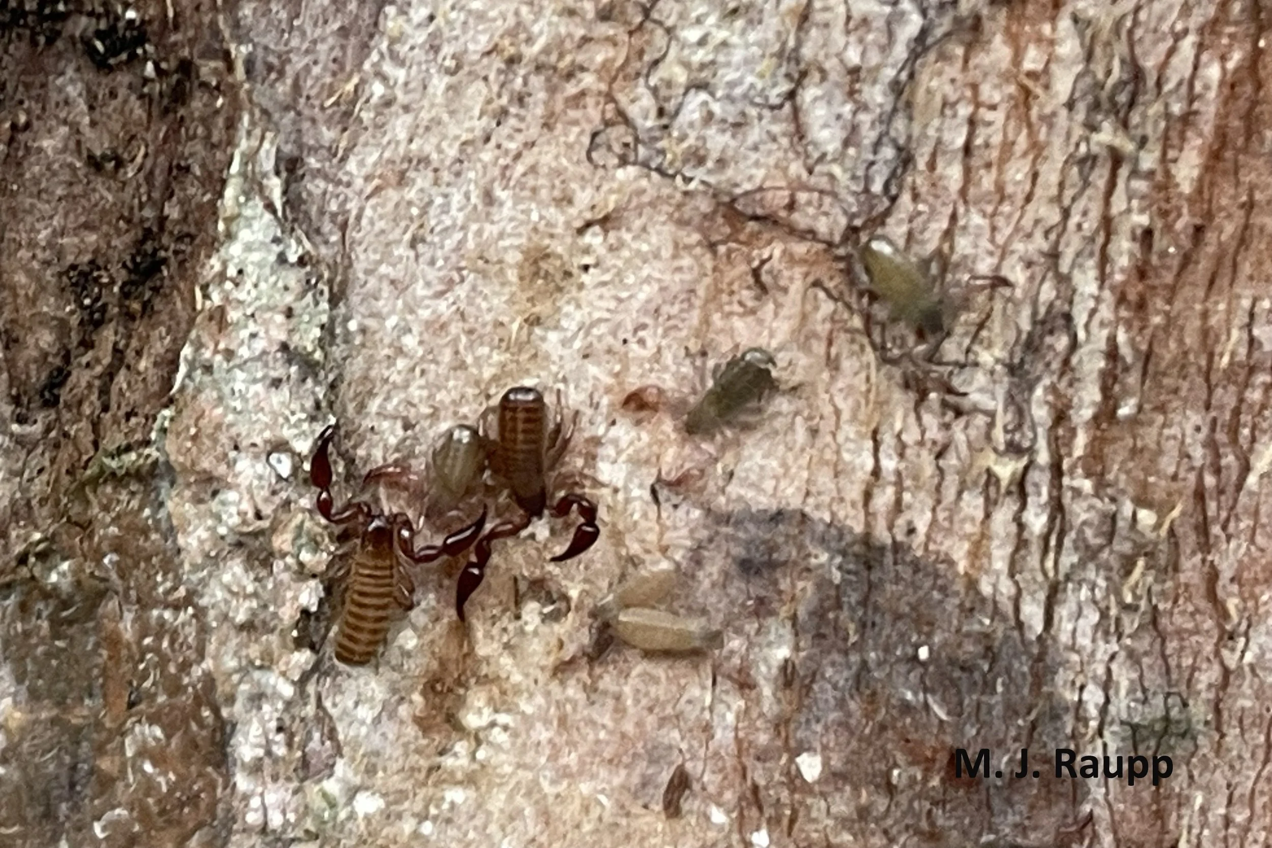 This week we continue our adventure in Belize where we previously met tasty termites, pretty peacock butterflies, and stinging scorpions. On the bark of an ancient sapodilla tree, we spotted a busy colony of tiny scorpion-like creatures milling about on the surface of the trunk. These tiny arachnids had impressive pinchers known as pedipalps that closely resembled those of their distant cousins, scorpions. Pedipalps of many pseudoscorpions contain venom used to paralyze prey prior to being dismembered and consumed. They secrete proteolytic enzymes designed to predigest their victims before slurping up the liquified tissues of their prey. I’m glad they are not as big as wolves.